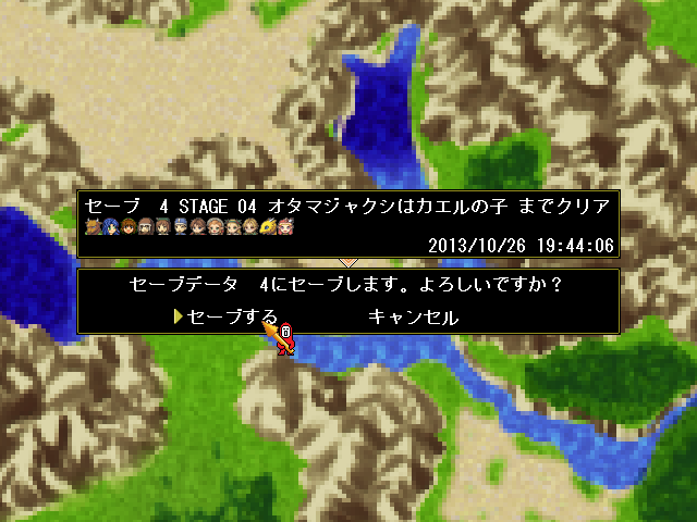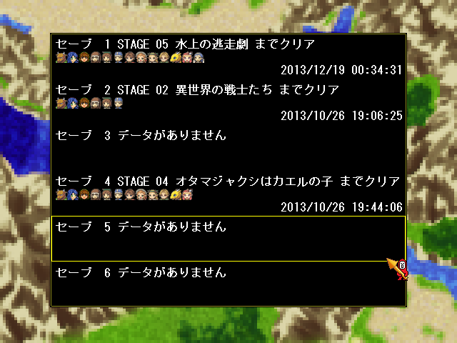 | セーブデータ一覧。今度はロードする。 ロードはタイトル画面からも行える。 |