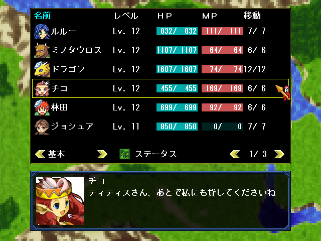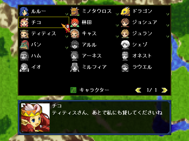 | キャラクター | 味方キャラクターの会話を見る。ステータスの確認も可能。 |