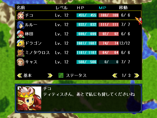 | カスタム | 味方キャラクターの装備品を変更したり、ステータスを上昇させる。 |