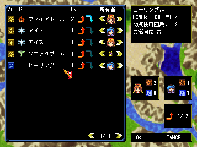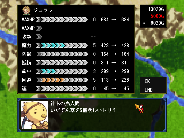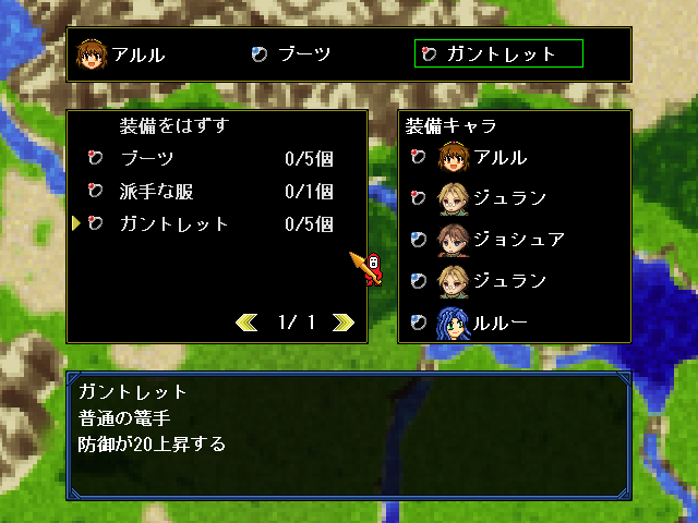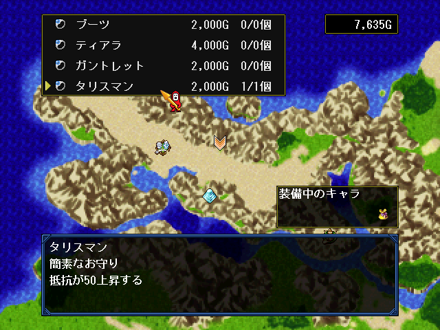 | 装備品の変更。折角装備品を手に入れても、誰かに装備させないと意味がない。 | ステータス上昇画面。お金を払い、キャラクターを強くすることができる。 |