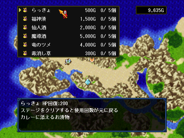 | 回復アイテムの購入。らっきょや仙人酒などおなじみの商品が並ぶ。 |